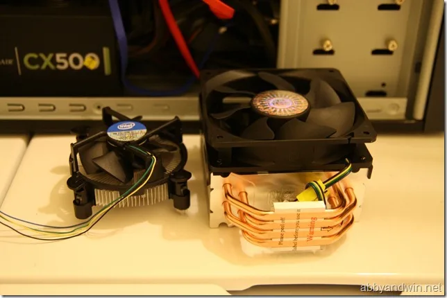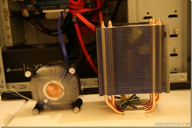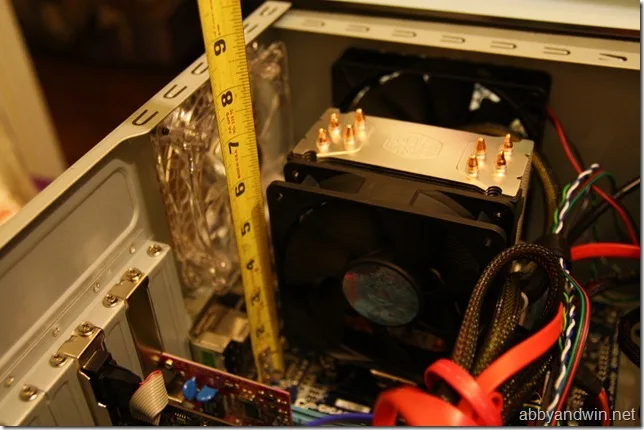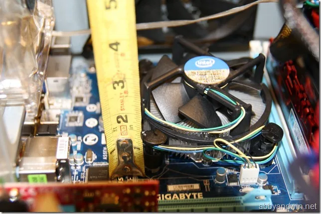 This is the old stock heatsink that comes with the Intel i5-2500K. Again, it does its job well but I was curious to try a different one. I measured the height just to give you an idea of the difference between the new and old heatsink and hope to show an estimate of how much clearance you’ll need in your tower.