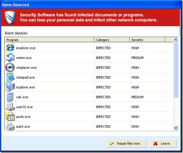My aunt’s PC got infected with a trojan virus. She called me and ask if she should use some kind of antivirus to clean her PC. I remember installing Microsoft Security Essentials and as she is describing the interface it didn’t sound familiar. I told her that the so called antivirus itself could be the problem. I came over to check it out and I was right. Somehow she clicked on something (very common) thinking it was something legit and installed it. I couldn’t get a screenshot right off her laptop coz it the trojan cranked up the resources to a point where it was nearly usable so I searched for a screenshot and here’s a sample.