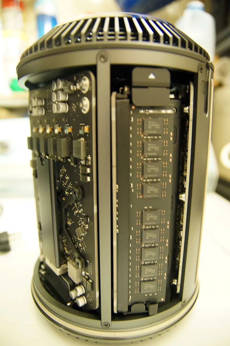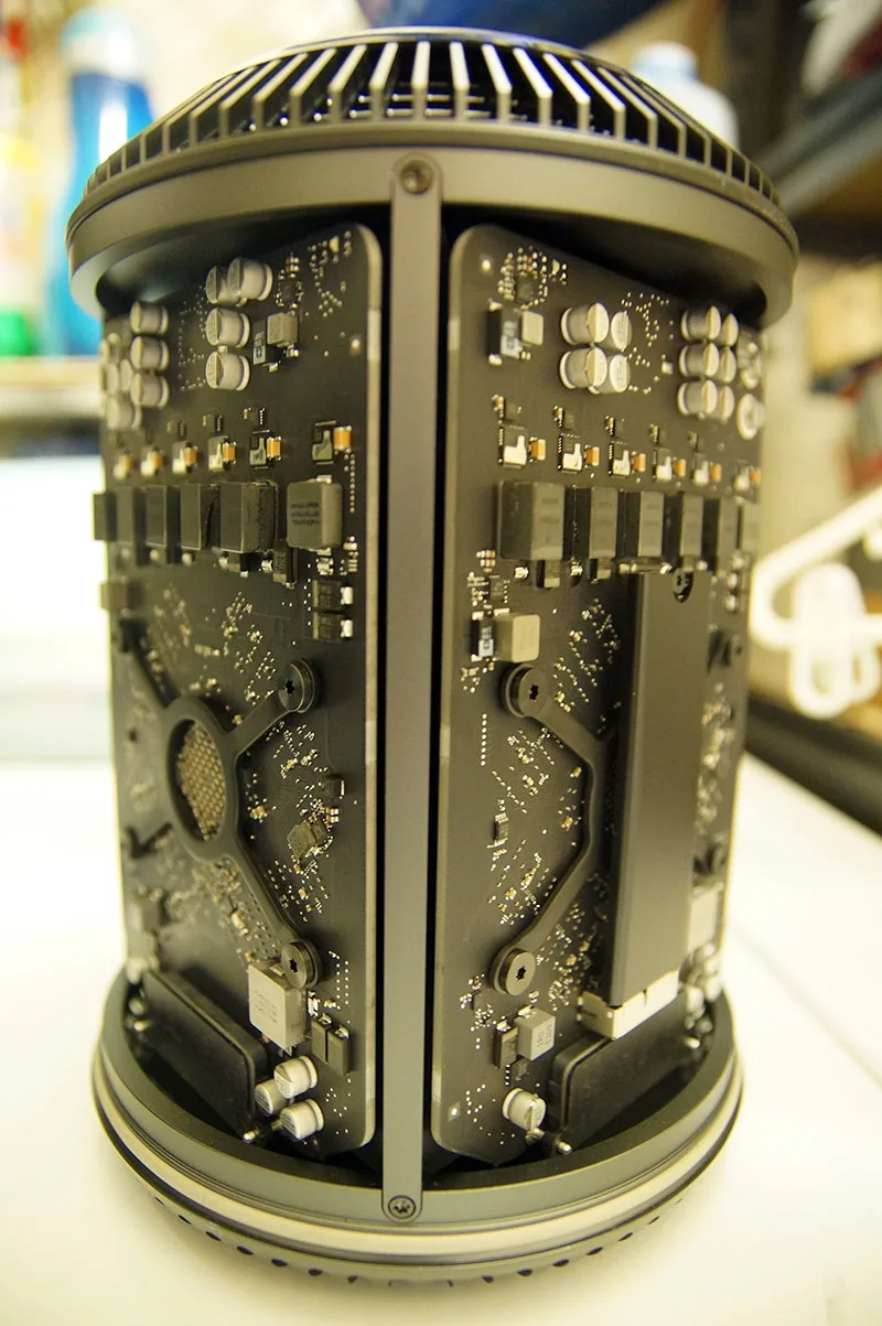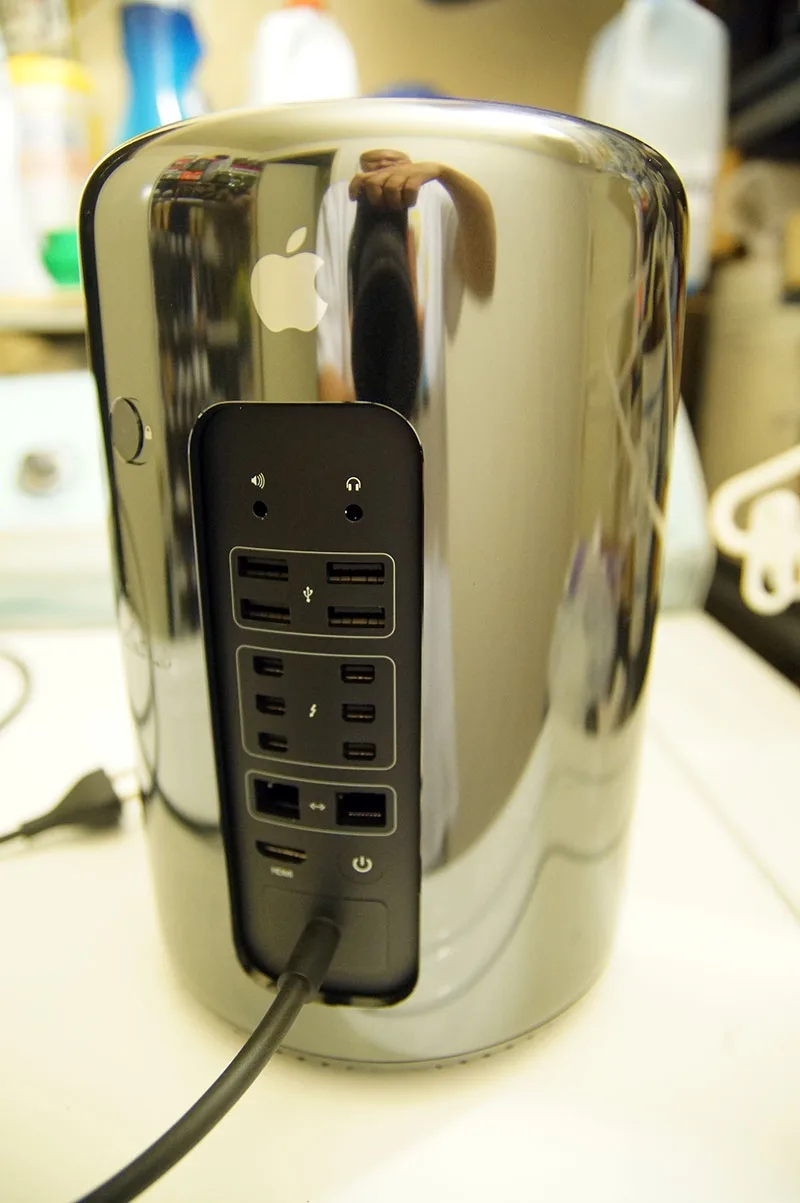 I recently got a new Late 2013 Mac Pro. So far it has been a great upgrade from my Dell T3600 at work. I took a few pics of the external and some internal.