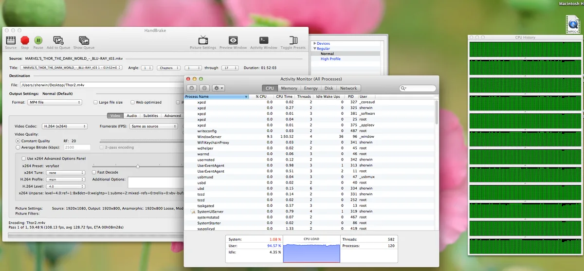 A screenshot that shows almost all 12 threads maxed out when running Handbrake.