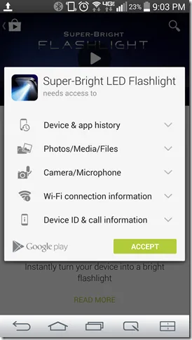 - There is no Flashlight app built-in. You can download some off the Play store but many of them want access to all sorts of things – a flashlight does not need access to all those private things.