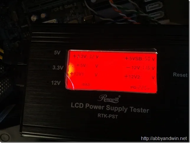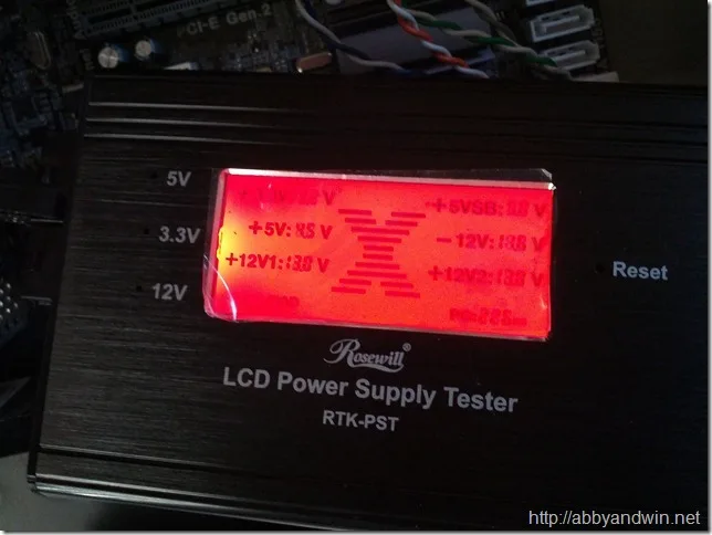 As soon as I plugged in the GX 450W, the PSU tester beeped and displayed a red color on the LCD with an “X”. It’s definitely the PSU. I’m filing a RMA now so we’ll see how that goes.
