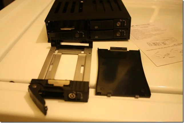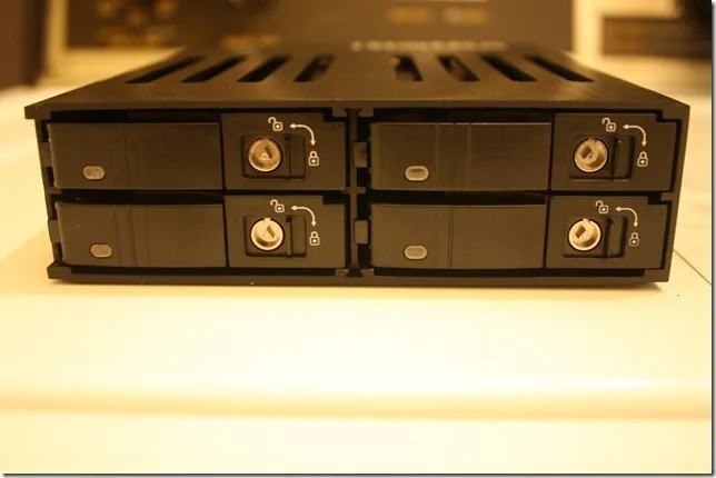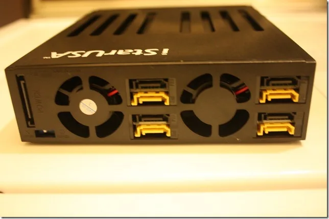 I’m also using a iStarUSA BPU-124V2-SS 5.25” drive cage. It’s a great little tray that holds 4x 2.5” drives – either SATA or SAS and supports up to SATAIII speeds. It’s very easy to install the drives and it has 2 fans. You only need 1 power cable to power 4 drives. It’s very nice and I highly recommend it if you will use 2.5” drives.