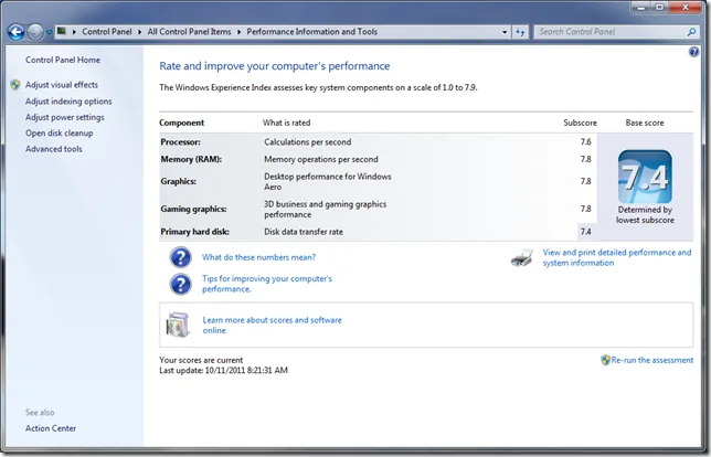 Now here’s the ATTO benchmark of the RAID0 using the SSD and the WEI score.